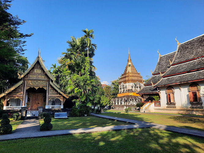 Wat Phra Singh dates back to 14th century and houses Chiang Mai’s most revered Buddha image, the Phra Singh in the precious little viharn in the back of the main ordination hall as you enter the complex. Beautiful mural paintings depict traditional Lanna life.