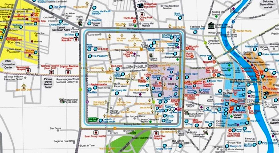 The old town surrounded by ancient walls is home to many of Chiang Mai’s precious temples or wats. This is the best place to begin your exploration- easy on foot or on bicycle. So set off on the back sois, wander through the wats, visit the museums and shops, enjoy the many great coffee places and whenever tired, get a foot massage or traditional Thai massage.