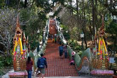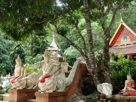 There is a gentle nature trail to Wat Phalad leading up from behind Chiang Mai University. Go to the end of Suthep Road and see the sign for the Nature Trail. Turn Right and follow the road uphill behind Wat Fay Hin. The road to the start of the trail is the steepest part of the journey, but transport is possible to the start of the trail and an entrance fee of 100 Baht is charged. Then set off on the walk about 40 min. through the forest. For serious walkers, from Wat Phalad, it is possible to continue on foot all the way up to Doi Suthep Temple.