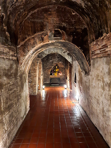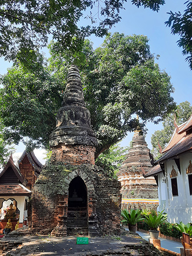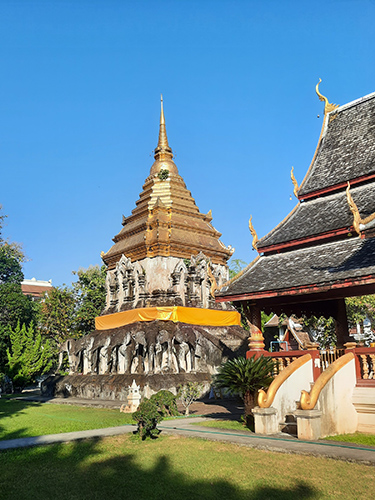 The Emerald Buddha was housed in the eastern niche of the chedi from 1468-1553. The Emerald Buddha was quite the travelling Buddha- first discovered in Chiang Rai in 1434 when lightning struck a chedi, revealing the green jade image, orginally hidden to protect it from invaders. This sacred Buddha image began the journey to Chiang Mai but the elephant carrying it, went on to Lampang first. While in Chiang Mai, the Lao King Setthatirat married a Chiang Mai princess and brought the Emerald Buddha to Luang Prabang in Laos for about 12 years. Luang Prabang is home to the Phrabang guardian Buddha image and when King Setthatirat moved the Lao capital to Vientiane, the Emerald Buddha was brought there. In 1779, the Siamese sacked Vientiane and brought the Emerald Buddha to Bangkok where the sacred image continues to reside at the Grand Palace.