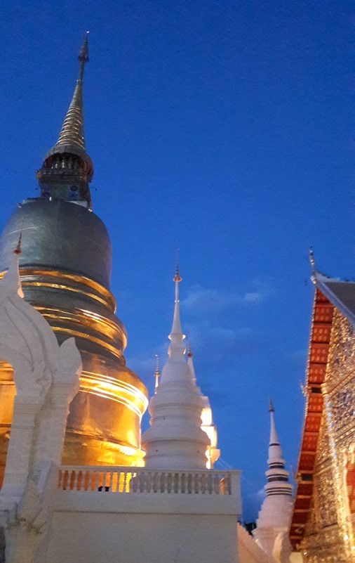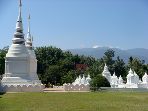 Wat Suan Dok means Temple of Flower Gardens. Established in 1371 by King Ku Na who invited the Ven. Sumana Thera from Sukhothai to bring Buddhist teachings from Sri Lanka to Chiang Mai. Sumana Thera brought a holy relic with him which had miraculously split into two pieces. One is kept at Wat Suan Dok and the other was placed on the white elephant which made its way up Suthep mountain and collapsed at the site where Wat Phratat Doi Suthep was then built. The graceful white stupas contain ashes of former Lanna royal family members.