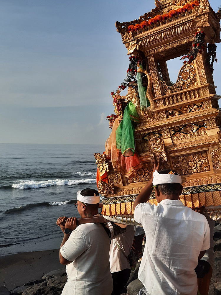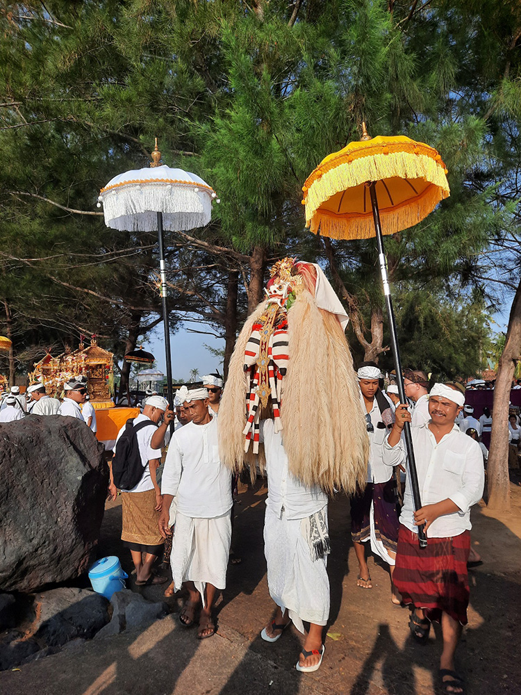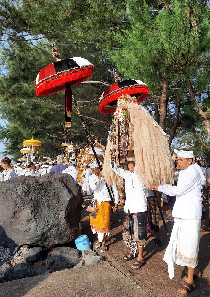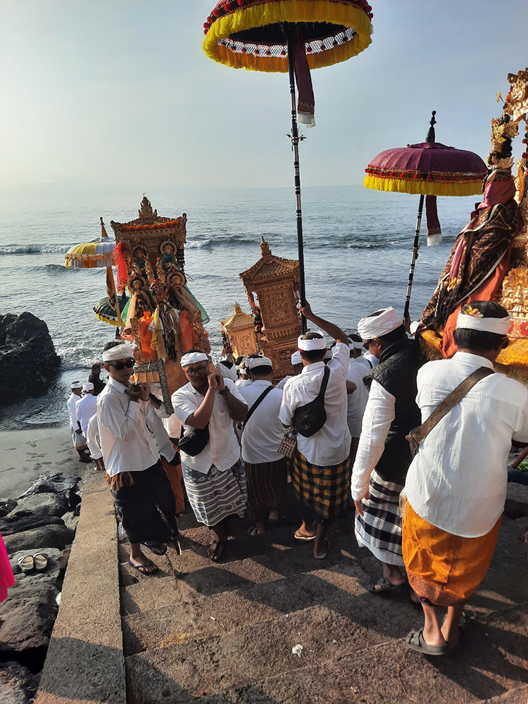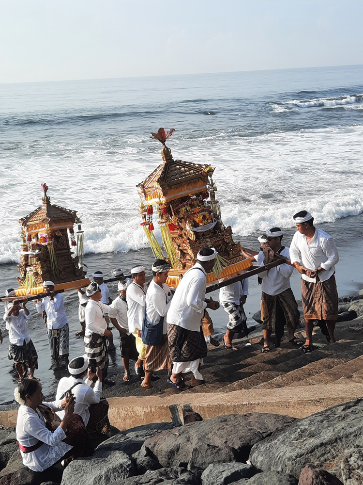 Leading up to Nyepi- Balinese New Year which falls on the Dark Moon of March, the Balinese bring sacred temple objects to the sea for a spiritual purification. Each village has a cardinal point by the sea.