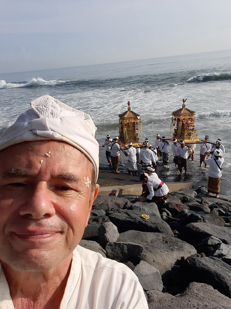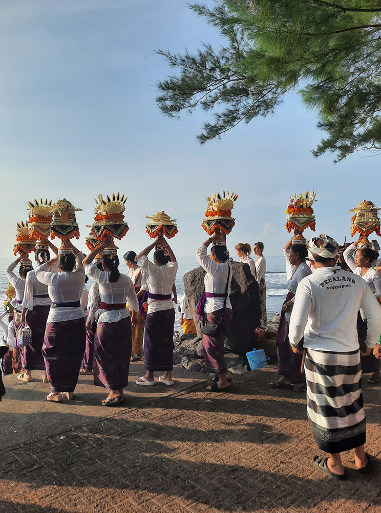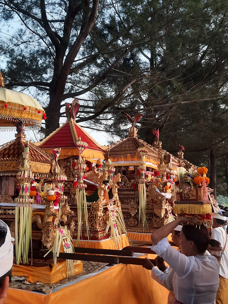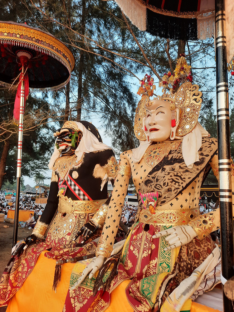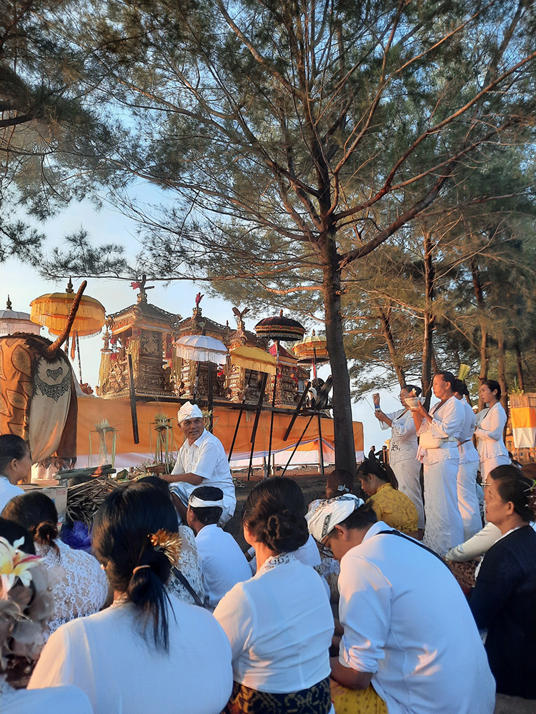 Leading up to Nyepi- Balinese New Year which falls on the Dark Moon of March, the Balinese bring sacred temple objects to the sea for a spiritual purification. Each village has a cardinal point by the sea.